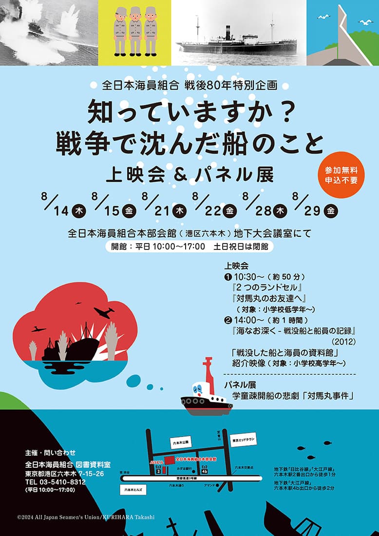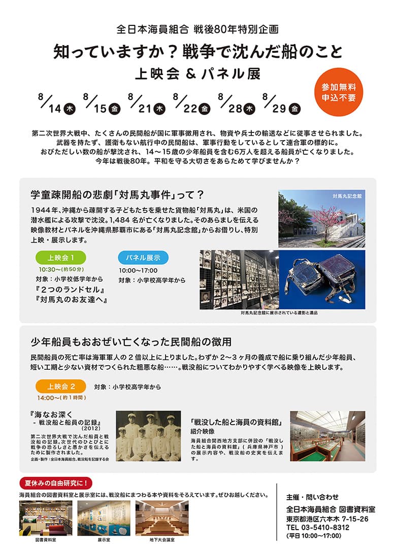 全日本海員組合では、2025年8月14日、15日、21日、22日、28日、29日に、戦後80年特別企画として「知っていますか? 戦没した船のこと」と題した上映会とパネル展を本部会館にある地下大会議室で開催しました。