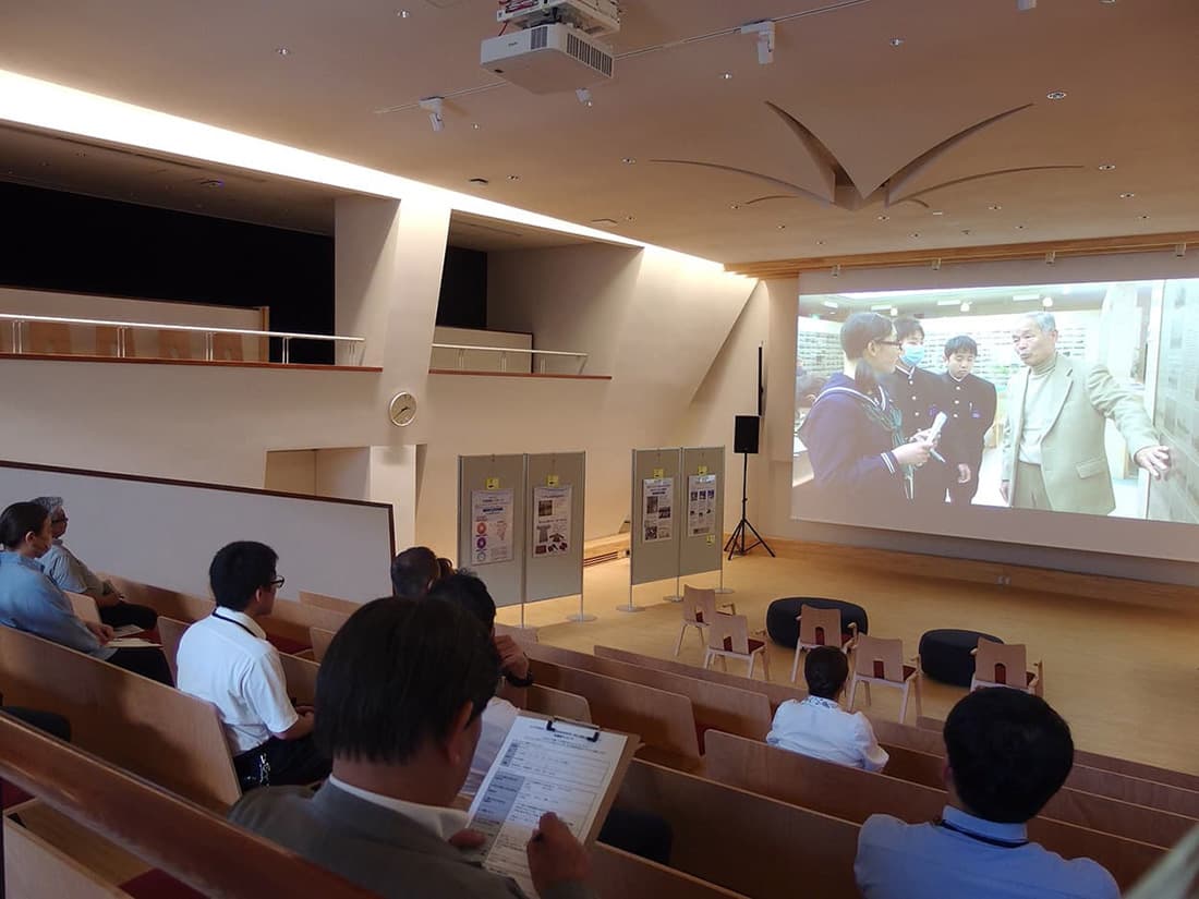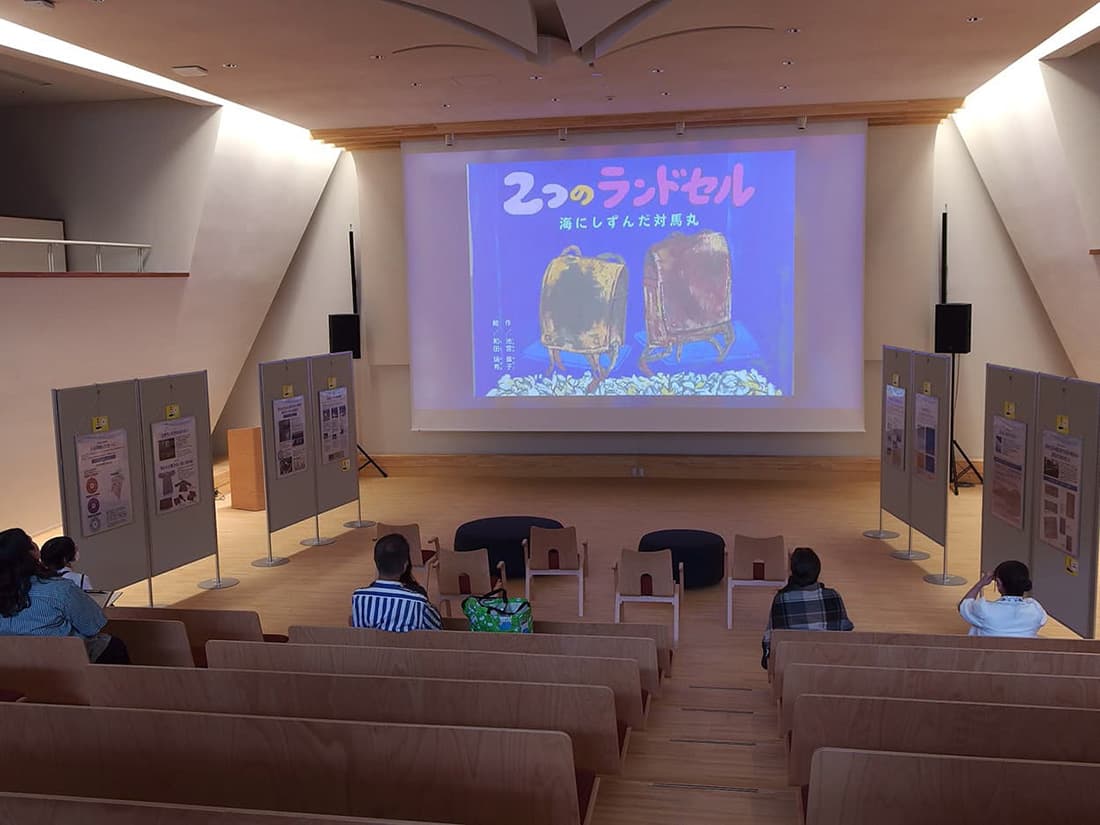 第二次世界大戦中の1944年に、沖縄から疎開する子どもたちを乗せた貨物船「対馬丸」は、米国の潜水艦による攻撃で沈没し、1,484名が亡くなりました。そのあらましを伝える映像教材『2つのランドセル』『対馬丸のお友達へ』と、詳細を記した展示パネルを沖縄県那覇市にある「対馬丸記念館」からお借りし特別上映と展示を行いました。